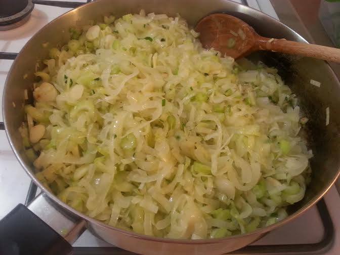 לבצל המטוגן מוסיפים: כרישה, שום, סלרי. וממשיכים לטגן.